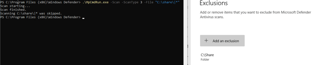 By utilizing the “|*” approach, Defender first verifies if the directory is on the exclusion list, since “|” is not a valid file or folder name (and therefore avoids a file scan even if the folder is not excluded).