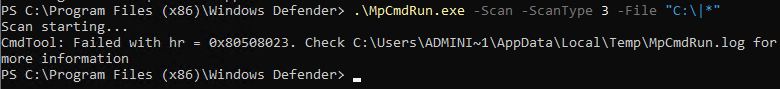 If the folder is not excluded, the system will return an error message stating “CmdTool: Failed with hr = 0x80508023. Check C:\Users\ADMINI~1\AppData\Local\Temp\MpCmdRun.log for more information” because of the invalid path created by the use of the “|*” syntax.